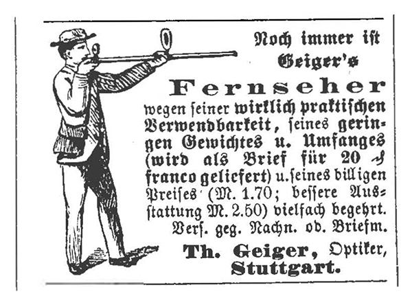 An advertisement for a “television,” an optical device that uses two lenses to magnify images at a distance, i.e. a telescope. Source: Illustrirte Zeitung (1884), repr. in Geiger, Fernsehen, 16.