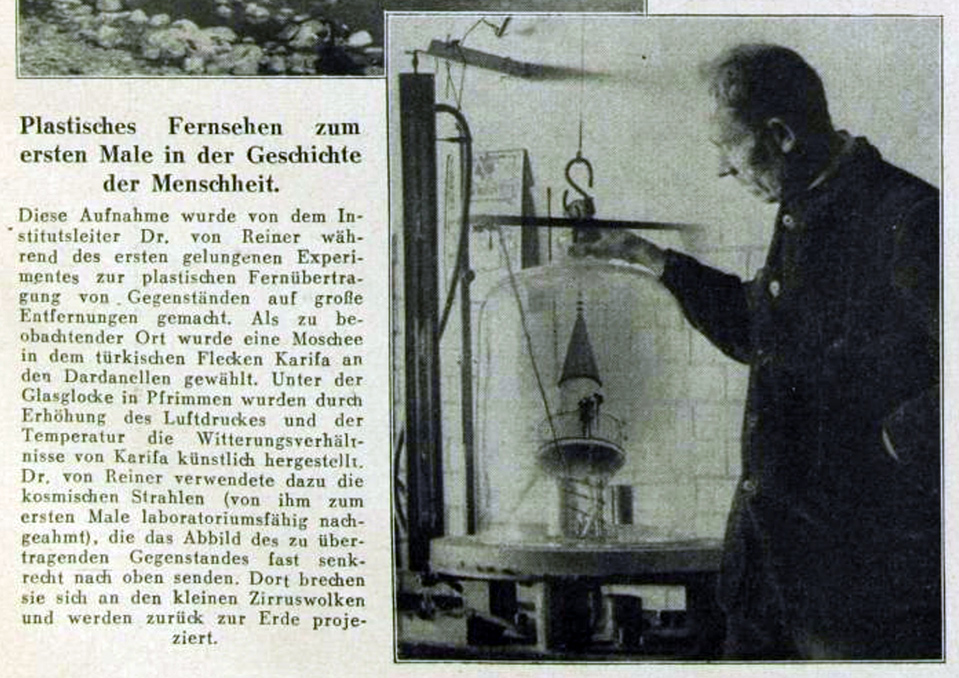A satirical image of “plastic television for the first time in the history of humanity.” The accompanying text describes related experiments conducted by the fictitious “Central Institute for Transmitting Sonic and Aerial Images.” Here, the imaginary director of the institute, Dr. Von Reiner, supervises the transmission of a Turkish mosque from the Dardanelles to a glass dome in the German laboratory via “cosmic rays.”