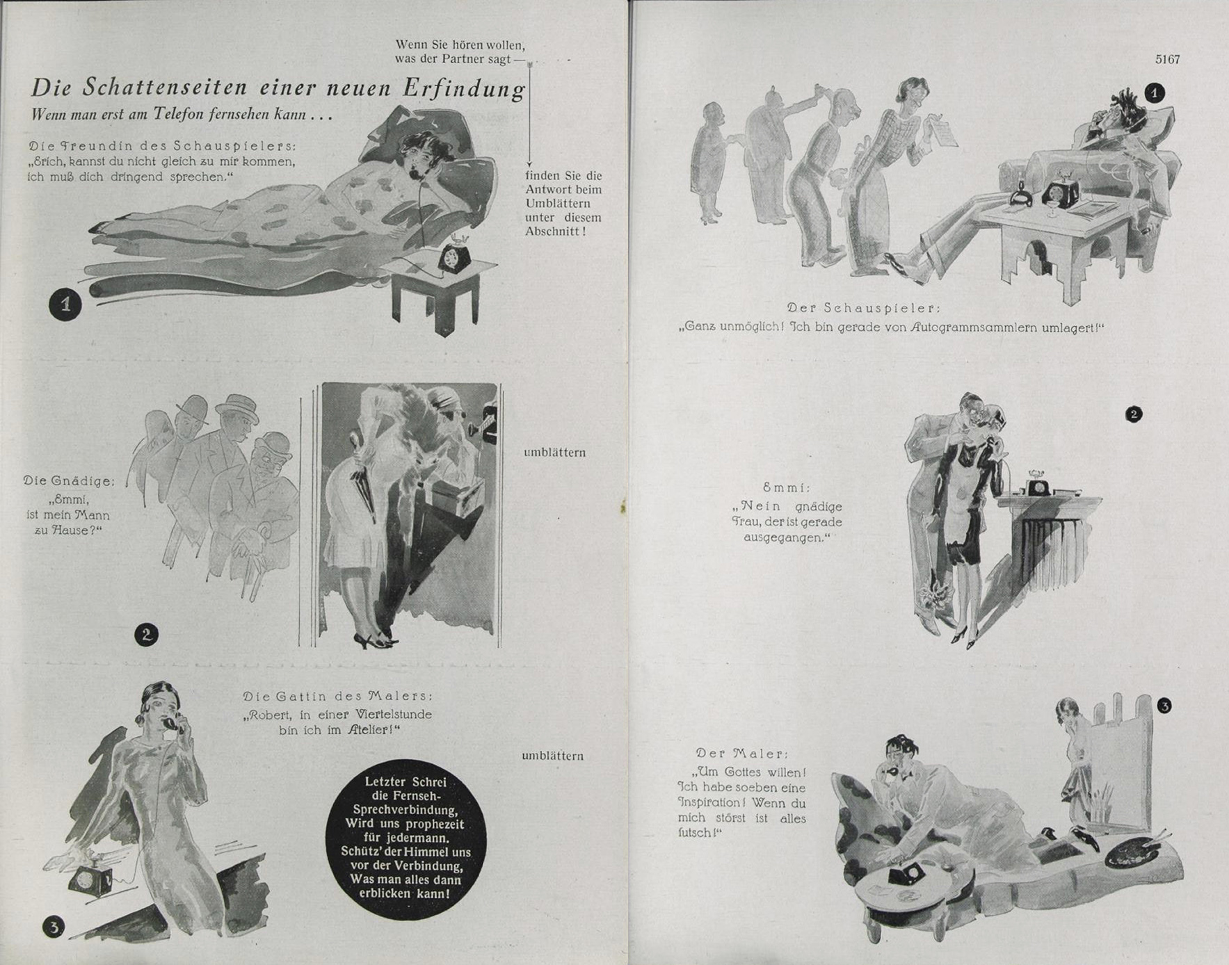 Jealousy, intrigue, and affairs are “the dark side of a new invention.” Imagining the implications of being able to be seen by television, the illustrator proclaims, “God protect us from connection, all the things we could catch sight of then!” Source: “Die Schattenseiten einer neuen Erfindung: Wenn man erst am Telefon fernsehen kann…” Das Magazin 73 (September 1930): 5165, 5167.