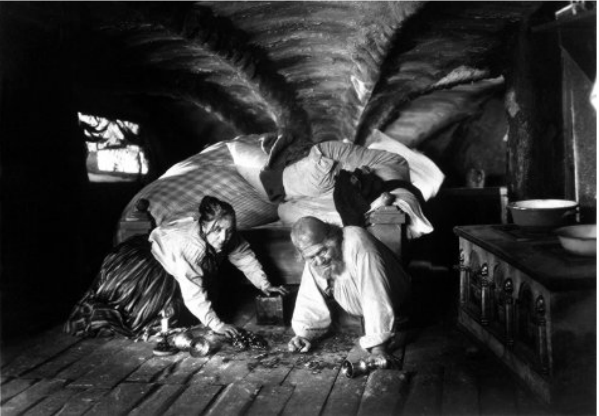 The homes depicted in Pabst’s films too, whether opulent or pitifully shabby, are cold with “no warmth, no nurturance.” In Pabst’s first film, The Treasure (1923), the family home has more economic than domestic value. It contains a secret hoard of stolen gold, and the mother squirrels away her savings in odd places. The people who live there are at odds with each other, and value the gold trapped in the house, rather than its sanctity as a family home. Stopping off on the way to this horrid house, the film’s hero visits a tavern, which by contrast is filled with warmth, communality, and the shared comforts of food, drink and sexual pleasure.